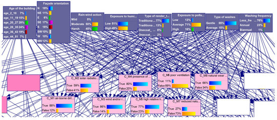The CPTs of the nodes mirror the specificity of the sample of Sá et al. [19], i.e., construction features are associated with the Portuguese construction sector methodologies and practices, while environmental specifications are typical of a metropolitan area with a Mediterranean climate. Relative frequencies were used as the probability measure. Figure 3 shows an excerpt of the BN model, where nodes are represented by boxes showing bar charts of the probability of each node. It is noted that “C-M1 Airborne dirt particles” (88%) is the most probable cause in the group of environmental actions. Additionally, in the first-level nodes, the prevalence of gentle washes (85%) on the sample of façades is evident.