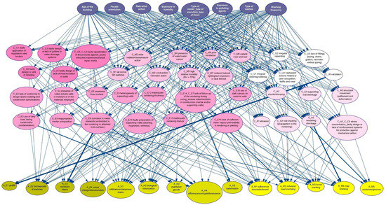 The graphical structure of the model reflects the relationships identified in the literature review, namely the characteristics of the building, façade and their exposure influence the rise of diseases (causes of defects), while the causes affect the occurrence of defects. Hence, three levels were designed. The colour of the nodes is also associated with their nature; i.e., first-level nodes are blue, second-level nodes are pink and third-level nodes are yellow. Different shades of pink were used to categorise the nodes of the causes of defects according to the groups of causes [23]: design errors, execution errors, environmental actions, mechanical actions, and wear and maintenance faults. Likewise, different shades of yellow categorised the nodes of defects [23] as aesthetical defects, defects associated with moisture and mechanical action-related defects. The arcs drawn between nodes determined that, to design and execution errors, only the characteristics of the building and façades were relevant, excluding exposure characteristics. The arcs between the causes and the defects were drawn according to the different scenarios of causality determined during the inspection process [19]. Figure 2 represents the graphical structure of the model.