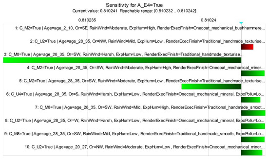 Nevertheless, as the sample [19] used to determine the CPTs was the same that had been used to validate the building inspection system [23], any minor incorrection not detected by those authors may have been transposed to the BN model. Additionally, that same sample does not have universal representativeness. Although it is representative of the Portuguese population of rendered façades, its applicability to other construction and environmental contexts may require further analysis, namely in terms of substrate materials (in the sample, masonry and concrete), the materials’ content of mortars (cement, lime, water and admixtures), exposure to weather agents according to climatic features and current maintenance activities (in the sample, only the type of washes and its frequency were considered).