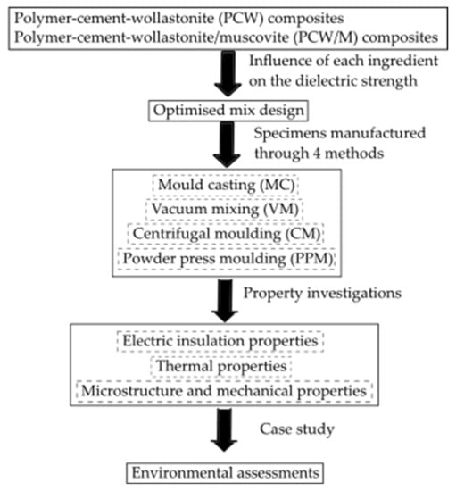 To this end, a series of experimental studies are proposed in this investigation to examine the performance of polymer-cement-wollastonite (PCW) and polymer-cement-wollstonite/muscovite (PCW/M) composites. The general flow chart of the experimental investigation embedded in this study is shown in Figure 1, with the details demonstrated in the following sections. An ‘optimised’ mix design and a suitable manufacturing method for styrene-acrylic polymer cement composites are proposed. The study presents the experimental results and assessment of the factors influencing the electric, thermal, microstructural and mechanical properties of PCCs, as well as a comparative environmental assessment. This work is part of a China Electric Power Research Institute-funded project that aims to develop sustainable electric insulating materials that can be used as structural elements []. The results provide key information on the fundamental properties of PCC materials and contribute to the development of cementitious construction materials with high-value electrical and thermal performance.