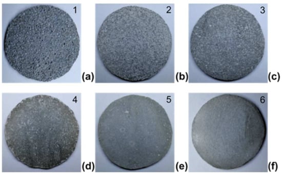 Optimisation of samples from mould casting with gradual improvement in compaction: (a) very poor, (b) poor, (c) acceptable, (d) good, (e) very good and (f) excellent. (Note: the lowest sample number ‘1’ indicates a poor homogeneity, and the highest sample number ‘6’ indicates excellent homogeneity).