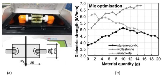 (a) Test machine and sketch of electrodes and specimen. (b) Change in dielectric strength with components added.