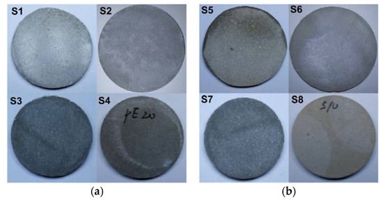 A rotary mixing machine with a capacity of 5 L was used for the mould casting (MC). Figure 2 shows the samples obtained through this mixing. Through a smoother appearance, from left to right, images of samples 1–6 showed gradual improvement in mix homogeneity and less porosity. The mixing rate was 200 rot/min. Initially, the styrene and acrylic (SA) emulsion and water were mixed together in the container for 1–2 min, and the water-to-cement ratio (w/c) was 0.25. The cement and filler particles were then mixed for 3–5 min. The ready mixed SA emulsion and additives were then added, and all the materials were mixed for another 20 min.
