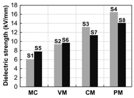 The dielectric strengths depicted in Figure 5 for the specimens from each group are listed in Table 2, determined as the average value of all three specimens. It can be noted that the manufacturing method had a significant influence on the dielectric strengths of the PCCs. Samples from the S1-PCW/MC and S5-PCWC groups, which were manufactured from mould casting, provided the lowest dielectric strengths. Compared with specimens from the other groups, the S1-PCW/MC and S5-PCWC specimens had the highest porosities, as the mixing procedure also introduced a large amount of air content. Compared with specimens from the S1-PCW/MC and S5-PCWC groups, the specimens from groups S2-PCW/MC and S6-PCWC, which were manufactured through vacuum mixing, provided around a 30% increase in dielectric strength. The vacuuming procedure reduced the air content in the mixtures, leading to enhanced insulation.