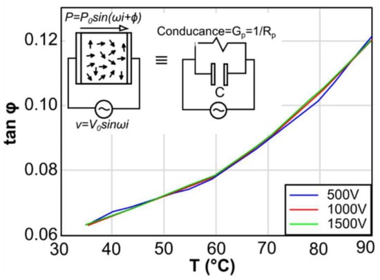 Dielectric loss of a solid material under the influence of an alternating electric field, represented by the dielectric loss tangent angle tanδ, defines the electrical energy dissipated by the motion of dipoles and free charges within the dielectric material as polarisation switches directions. A high value of tanδ indicates a large amount of electric energy loss, which is converted to thermal energy. The admittance of a dielectric material under an alternating voltage is equivalent to a parallel combination of an energy lossless capacitor C’ and resistance Rρ, which causes the loss of electrical energy as shown in the top left of Figure 6. In this study, the testing arrangements included a bridge circuit, a vacuum container with solid electrodes, a vacuum pump and a high voltage power supply with temperature adjustment [].