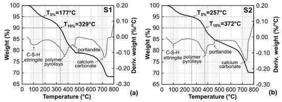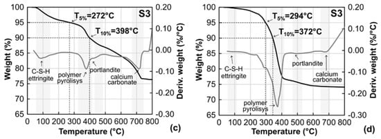 As indicated by the black curves in Figure 8, samples from all the groups lost 5% of their mass at temperatures (T5%) of 170–300 °C. The highest thermal stability up to 300 °C was shown for S4. This was followed by decomposition of the hydration products. It can be noted that samples from S1, S2 and S3 showed a mass loss of more than 2% at a temperature between 100 and 200 °C. No pyrolysis of the polymer or inorganic powders occurred at this temperature; hence, the mass loss was caused by the vaporisation of the water content and other volatiles. This was also captured through the first derivative of the weight, represented by the grey curves. The first peak was observed around 100 °C, which corresponded to water evaporation, followed by decomposition of the hydration products. A 10 percent (T10%), mass loss was observed at 329–372 °C. This was associated with a relatively sudden drop in the weight loss–temperature curves (TGA) and the highest peaks in the derivative curves (DTG). As shown in previous studies, cementitious materials are relatively stable in the range of 300–400 °C without any major component being eliminated from the composite. Implicitly, the mass loss and corresponding peaks on the derivative curves were associated with polymer pyrolysis, which was shown to occur between 350 and 430 °C.