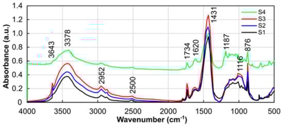 Through the FTIR analysis, it was shown that quantitative variations in terms of absorbance values occurred as a function of the manufacturing methods of the PCW composites. A clear difference was observed between S4 and the curves of the other three groups (S1–S3). Implicitly, the inherent different porosity and free water in the sample had an impact on the absorption of infrared light. On the other hand, the FTIR results for samples from the S1–S3 groups showed a similar hydration process and reactions within the material with some influence from the manufacturing method.