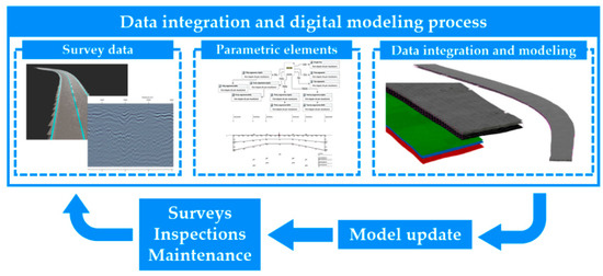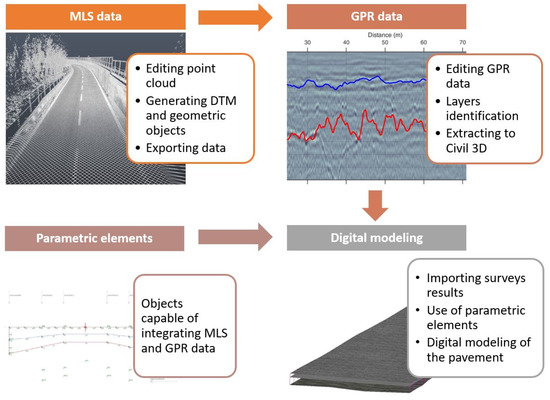 The main objective of this study was to define a first potential methodology to integrate different datasets generated from non-destructive surveys carried out on a linear transport infrastructure within a BIM model. Making use of different software programs the integration between MLS and GPR data was successfully carried out, generating a digital model of the pavement of a road. The point cloud obtained from the laser scanner allowed the geometric definition of the model and its position in a georeferenced system. The data generated by the GPR was used to determine the thickness of the pavement layers, allowing the model to be defined in three dimensions. The resulting digital model was used to carry out useful analysis regarding the state of the superstructure, even in areas that usually cannot be reached by operators.