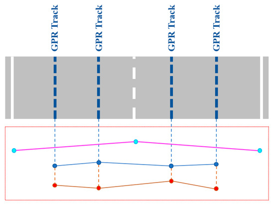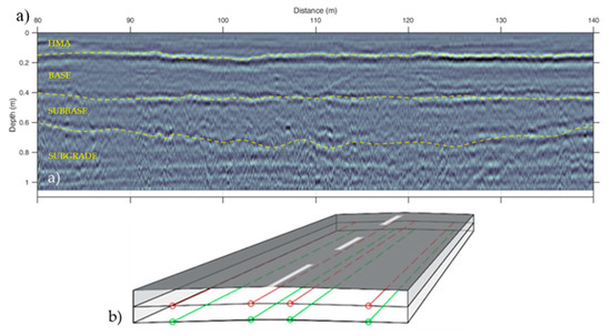 In fact, starting from the receiving time of the reflections in the processed data, the depth of the layers’ interface was obtained by comparing the GPR signal collected in correspondence to the position of pavement corings. As a result, for each GPR scan, it was possible to recognize the configuration of the pavement layers, as shown in the example in Figure 8a.