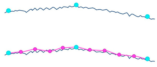 A further parameter required for the functioning of the parametric section is the three-dimensional surface generated by the point cloud obtained from the laser survey. Making use of a certain number of segments for each lane, this surface can be reproduced with an adequate level of approximation within the model (purple lines in Figure 9). The said number can be chosen during the modeling phase. This can vary from a single line for each lane to 100 segments for the whole carriageway, depending on what the model is going to be used for, as its computational complexity varies along with the precision used to recreate the pavement. This allows a digital reproduction of the infrastructure to be obtained characterized by a certain surface irregularity that approximates the one present on-site. Another use of this surface is to provide the reference from which to determine the depth of the superstructure layers.