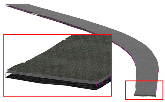 To create the necessary model of the analyzed road, Autodesk Civil 3D was used [26]. An alignment was created using the central three-dimensional polyline extracted from the point cloud, so that the road model would follow both the planimetric and altimetric features of the existing road. Once the parametric section was assigned to it, it was then extruded along its axis line, thereby generating a three-dimensional model of the pavement whose dimensions vary in relation to the 3D polylines extracted from the surveys. The model is configured as three superimposed planes, which together form the package of the superstructure, as reported in Figure 11 below. The proposed methodology then allows for the creation of a new road model by relying only on data generated from surveys carried out on site. Moreover, specific information regarding the real infrastructure present on site can be assigned to the model, such as the materials that constitute the road superstructure or the direction of travel of the modeled carriageway.