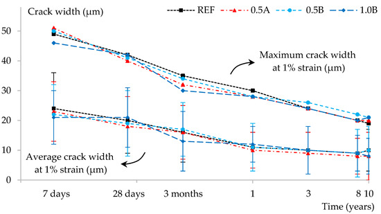 The results obtained were compared to the same batch of specimens tested at 7 days, 28 days, 3 months, 1 year, 3 years, and 8 years of age [37]. The results in terms of average crack widths and maximum crack widths are given in Figure 1.