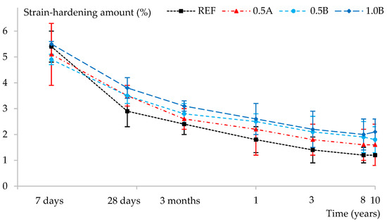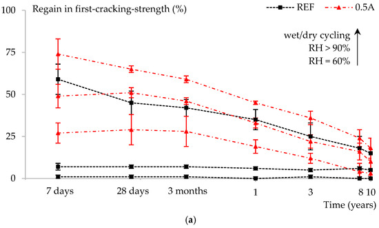 Considering the results of the reference system in Figure 4, 28 days of healing in wet–dry cycling results in a regain in mechanical properties of about 60% at 7 days of age. This decreases to approximately 45% at 28 days of age and is still 15% at 10 years of age. The inclusion of 0.5 m% SAP A increases these values to 75%, 65%, and 20%, respectively. This is a notable increase, which is even better when 0.5 m% or 1 m% SAP B is added, with a maximum of 85%, 80%, and 30%, respectively. This shows the positive influence of SAPs in terms of promoting autogenous healing.