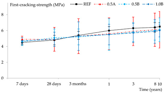 The first cracking strength (MPa) of all samples studied, as a function of time, measured as the first drop in the stress–strain curve.