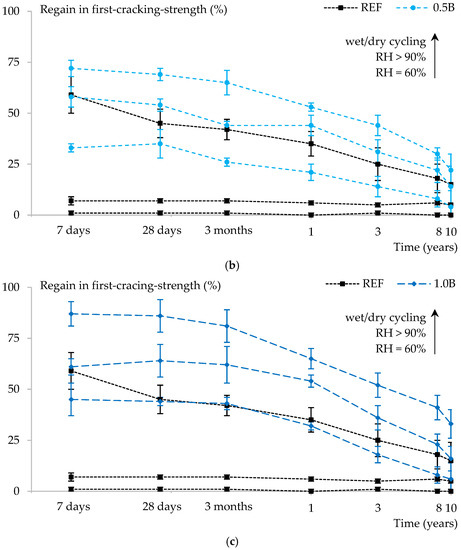 The regain in mechanical properties, measured by dividing the first cracking strength at reloading and the first cracking strength at preloading, is presented in Figure 4 for 0.5 A (a), 0.5 B (b), and 1.0 B (c), respectively, compared to the reference samples. Each subfigure shows the healing (y-axis) of an SAP sample series as compared to the reference after being cracked at a certain age (x-axis) and healing for 28 days at the different curing conditions. These curing conditions are depicted from bottom to top as: RH = 60%, RH > 90%, and wet/dry cycling, providing three datasets per sample series. The more water is available, the more regain in the first cracking strength is observed, hence the logical order of curves from bottom to top.