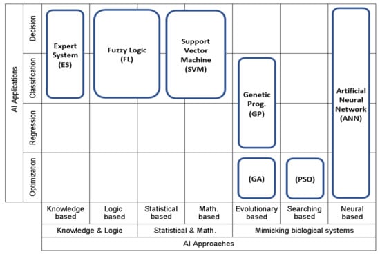 AI techniques are the mathematical approaches developed to search for the optimal solution for complicated problems within the available time and resources (hardware, software and databases). The more time and resources allowed, the more accurate and the better solution that the AI can reach. There are two main types of AI approaches, one of them is based on mimicking the behavior of natural creatures and the other one depends on logical, mathematical or statistical approaches. Each type of them can deal better with specific types of problem. The first one (such as ANN, GA, GP and PSO) is better for inaccurate, distorted and incomplete data, while the other one (such as ES, FL and SVM) will be better for problems that need proof and reason. Accordingly, a suitable technique for certain problem could be selected based on problem type, data quality, data distribution and search restrictions. Figure 2 presents a classification for considering AI techniques by approaches and applications.