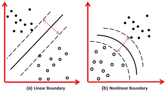 SVM is a classification technique with a statistical basis that is used to find the best boundaries between classes (which have the widest margin). The formulas of these boundaries could be linear or non-linear. Figure 6 describes the difference between linear and non-linear boundaries and the concept of margin in 2D-space. It is very efficient, especially for multi-classes in higher dimensions where the boundaries can’t be presented graphically [1].
