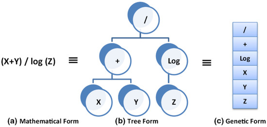 GP is a special application of GA wherein the considered problem is to optimize a mathematical expression to fit certain observations; hence, GP is a multi-variable and free structure regression technique. The individual solutions of GA are presented by mathematical expressions in GP, and the fitness function of GA is replaced by the sum of squared errors (SSE) in GP. Finally, to apply GA on mathematical expressions, they must be coded in genetic form first. Figure 8 presents how to translate a formula from mathematical form to tree form and then to genetic form. Today, GP is a main technique, including many sub-techniques such as linear and Cartesian genetic programming (LGP) and (CGP), in addition to gene expression programming (GEP) and multi-gene expression programming (MGEP) [1].