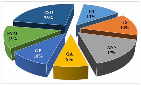 Every single topic of these is working together to improve the roads. PSO is one of the earliest AI techniques that has too many branches. After research, it was found that it has the largest share of research on infrastructure. Almost every branch has been used, such as ant colony optimization. Some of them will be mentioned here, collected from 2006 to 2019. They studied routing problems, congestion management, the design of roads, scheduling for vehicles using roads, the planning of gas and recharging stations, road extraction by satellite images and traffic forecasting [38,39,40,41,42,43,44,45,46,47,48,49,50,51].