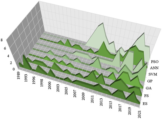 A total of 57 researchers were concerned about these topics; 15 of them used PSO, and 13 used ANN.