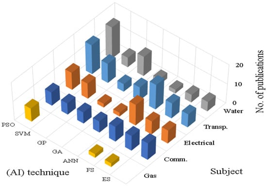 Five subjects (transportation, water, gas, electric and communication networks) and eight AI techniques (ES, FS, ANN, SVM, GA, GP, PSO and others) were considered.