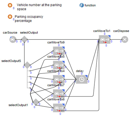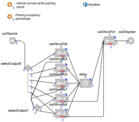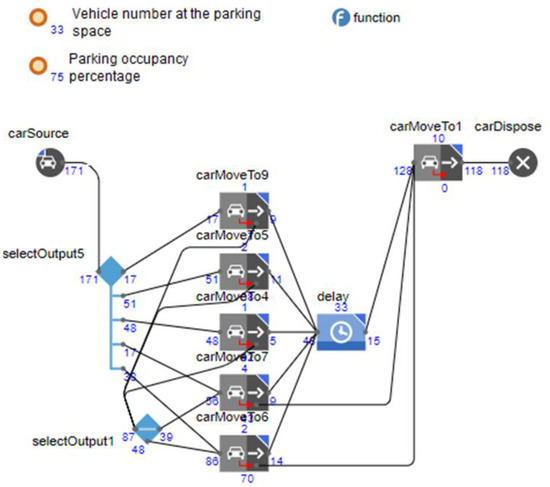 In the simulation model, 5 parking areas are implemented in the entire parking lot. Thus, agents called vehicles are created in the carSource block. Next, a route is selected for these agents in the selectOutput block with a certain coefficient: to drive into the parking lot or drive past it. This is necessary because not all vehicles enter the parking area. Subsequently, agents that do not enter this territory follow the route on the map, pass by using the carMoveTo1 block and then are destroyed in the carDispose block. Otherwise, when the vehicles enter the parking area, the agents have a choice regarding which of the 5 parking lots to choose. This choice is not made by chance. After conducting a full-scale experiment in the parking space, the percentage of parking lots occupied by vehicles was identified and substituted into the simulation model. The carMoveTo (4,5,6,7,9) blocks are intended for the graphical installation of agents in the parking lot. Further, after installing agents in a parking space, a delay timer is needed to simulate the time for which the vehicle is left in the parking lot. After the time expires in the delay block, the vehicles leave the parking lot using the carMoveTo1 block, after which the agents are destroyed in the carDispose block.