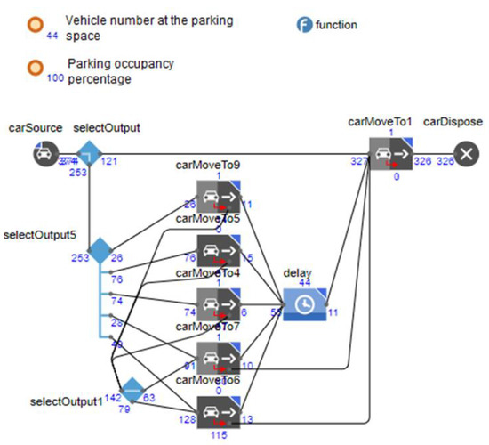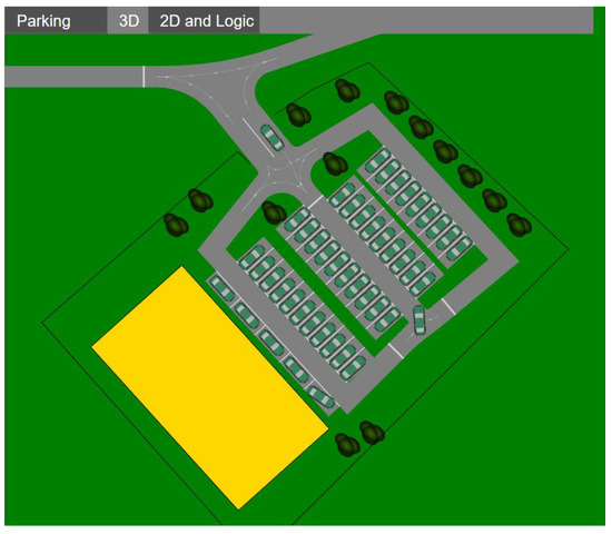 This model of the parking space, which does not record vehicles, was created in order to determine the degree of its maximum occupancy. The experiment performed on the simulation model of the original parking type (Figure 7) showed that, at a certain point in time, there are no parking spaces left and the fitness center clients cannot leave their vehicles in the parking lot.
