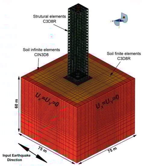 Mesh sensitivity analysis was performed to reduce the computational time of the analysis. For meshing, various element distributions, which were designated as very coarse, coarse, medium, fine, very fine, and refined, were used generating 27,628, 68,248, 134,462, 268,612, 352,840, and 153,572, elements respectively. Considering the computational time and the accuracy of the results, the refined element distribution was found to be the most efficient for meshing purposes when compared to the other element distributions; hence, the refined element distribution was adopted for model meshing. Indeed, finer meshing was used near points where large amounts of stress were concentrated, and coarser meshing were used in places that were further away from these highly concentrated areas of stress. The soil and structural elements were defined as solid parts, and they were coupled with C3D8R elements in order to avoid reflecting earthquake vibrations back into the model. The far-field soil was modelled using the infinite CIN3D8 elements that were used to absorb the vibrations from the unbound soil, as shown in Figure 5.