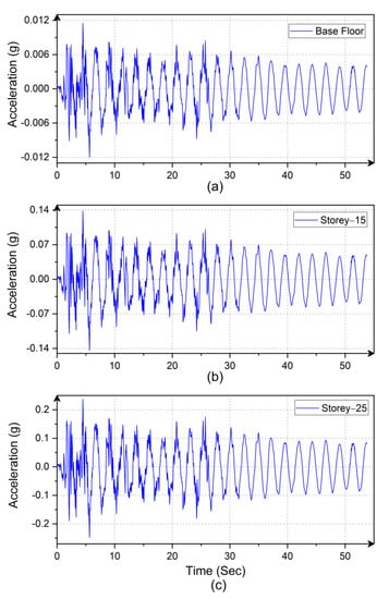 Acceleration (time–history) plots of the various story levels of the building: (a) Base Floor; (b) Story-15; and (c) Story-25.