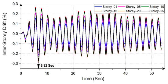 The time–history plots (acceleration and inter-story drift) of the various floor levels of the 25-story building, which was supported by the FP-Mats mentioned above, are shown in Figure 10 and Figure 11, respectively. The provision of an FP-Mat under a multi-story building drastically enhances seismic behavior, and thus, the peak acceleration and inter-story drift of the top floor were reduced by 99.99%, in comparison with the RP-Mat, thereby reducing the effects of detrimental vibrations on the building.