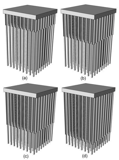 Three-dimensional finned pile-mats of varying fin-lengths (Lf/Lp) used in the SSI analyses: (a) Lf = 0.2Lp; (b) Lf = 0.4Lp; (c) Lf = 0.6Lp; and (d) Lf = 0.8Lp.