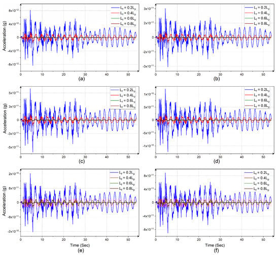 Time–history plots of the FP-Mats for the various floor-levels of the multi-story building: (a) Base Floor; (b) Floor-05; (c) Floor-10; (d) Floor-15; (e) Floor-20; and (f) Floor-25.