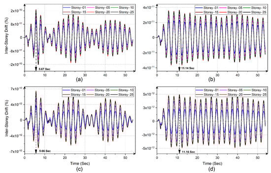 Time–history plots for the inter-story drifts of various floor levels for the structure resting on FP-Mats of different fin-lengths: (a) Lf = 0.2Lp; (b) Lf = 0.4Lp; (c) Lf = 0.6Lp; and (d) Lf = 0.8Lp.