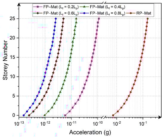 The variation in peak acceleration for all floor levels was plotted for all considered FP-Mats of various fin-lengths, as shown in Figure 12. It was observed that the response of the building was stiffer for all the piled-mats after Story-10 (this finding is also shown in Figure 10, as the time–history plot of the inter-story drift was somewhat similar for all floor-levels above Story-10). Figure 12 shows that the peak acceleration experienced by the top floors ranges between 15 to 20 times that of the base floor. Moreover, the reduction in peak acceleration, compared with the RP-Mat, was somewhat diminished by the provision of the FP-Mat.