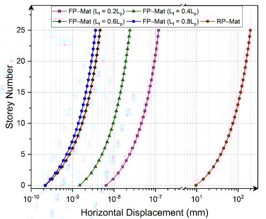 - Compared with the RP-Mat, the using FP-Mats during the construction of high-rise buildings can reduce horizontal displacement by 1.7 × 109, 8.2 × 109, 4.3 × 1010, and 5.5 × 1010 times for FP-Mats with fin-lengths of 0.2Lp, 0.4Lp, 0.6Lp, and 0.8Lp, respectively.