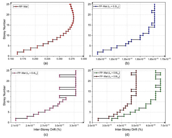 Variation in the inter-story drifts for buildings resting on various piled-mats: (a) RP-Mat; (b) FP-Mat with Lf = 0.2Lp; (c) FP-Mat with Lf = 0.4Lp; and (d) FP-Mats with Lf = 0.6Lp, 0.8Lp.