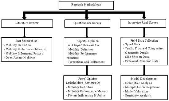 The research started with a literature review of the current (open-access and partially controlled-access) multilane highway mobility definition, measurement, and factors influencing mobility. In the second phase, a preliminary questionnaire was developed based on the knowledge gathered from the literature review, and a pilot survey was conducted among selected field experts. In the next step, road users and people from different fields (agency officials, designers, and related educationists) were personally interviewed to answer the research questions. The data were analyzed using the statistical software SPSS to determine the most important mobility influencing factors. The one-way analysis of variance (ANOVA) test was also performed to evaluate the statistical difference of opinion among different survey groups. Based on the results of the above investigation, detailed field data were collected from an open-access multilane highway. Finally, a statistical model was developed relating highway mobility and its influencing factors.
