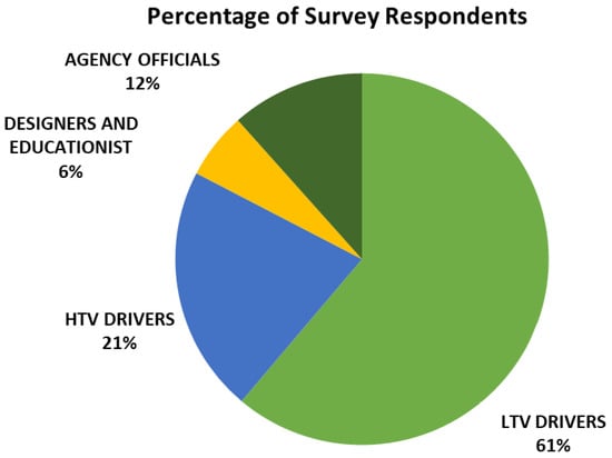 In Pakistan, getting driver reviews is difficult due to the variability in driver characteristics based on their level of education. Therefore, it was decided that each participant should be personally interviewed in a roadside survey to obtain a complete and sincere response. It also ensured the inclusion of a variety of survey respondents, mainly commercial vehicle users. A total of 400 individuals with diverse sociodemographic backgrounds were interviewed. Survey respondents were divided into four groups: LTV (light transport vehicle) drivers, HTV (heavy transport vehicles) drivers, agency officials, and educationists. The category of LTV drivers included respondents of private cars, taxis, and wagons, whereas HTV drivers included respondents of buses, trucks, and trailers. The percentage of each group is shown in Figure 2. Salient details of respondents include: (a) 89% were male; (b) 63% had a driving experience between 5 and 20 years: (c) 72% of the survey respondents had adequate knowledge of traffic rules and regulations; (d) 57% of the participants reported driving more than 100 km per day on open-access multilane highways, which ensured the efficacy of collected data.