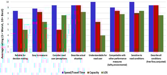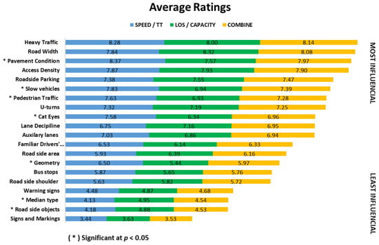 This study also explored the association of different performance measures with users’ perceptions. It was found that factors directly impacting instantaneous speed (heavy traffic, slow vehicles, pedestrian traffic, and road condition) were highly rated by drivers when considering speed/travel time as a performance measure (Figure 4). However, for LOS/capacity, all those factors that reduce highway capacity (lane width, roadside parking, and roadside shoulder) were highly rated. A one-way ANOVA test was also performed on data to compare the means of different groups (using the F-distribution). The results revealed a significant difference of opinion (p < 0.05) on pavement condition, slow vehicles, pedestrian traffic, cat eyes, geometry, median type, and roadside objects when rated against two performance measures (Figure 4) [41]. The above discussion established that the importance of mobility impacting factors also depends on the performance measures used for analysis.