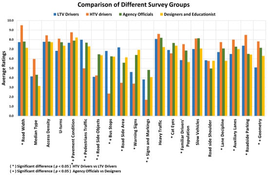 - Further analysis was carried out using one-way ANOVA tests to determine the significant difference of opinion (p < 0.05) between different survey groups. Results revealed that HTV and LTV drivers disagreed (p < 0.05) on fourteen factors (mentioned with * in Figure 5). Similarly, a significant difference of opinion (p < 0.05) between agency officials and designers was also observed on pavement condition, pedestrian traffic, bus stops, signs and markings, and geometry (mentioned with + in Figure 5) [41].