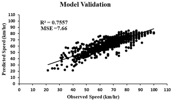 Before model development, the data were randomly segmented into two datasets: one for calibrating the model (80%) and the other for validating the developed model (20%) [70]. The validation was performed by comparing the predicted speed values computed using the developed model with actual speed values observed on the field. The comparison result indicated that the predicted speed values agreed with the observed values (Figure 6). The R-square value of 0.75 between the observed and predicted values indicated that the model is valid [69]. The predictive capability of the developed model was also tested by calculating the mean squared prediction error (MSPE) using the developed model parameters and the new dataset by comparing it with the mean squared error (MSE) of the developed model. The model MSPE (8.77) was close to the MSE (7.66), demonstrating that it yields satisfactory validation results [69].