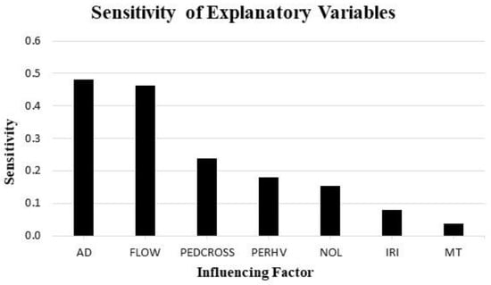 The sensitivity of each explanatory variable was also explored based on standardized regression coefficients in the finalized model (Figure 7) [23]. Analysis showed that the most significant independent variable impacting the speed was access density (0.48), followed by the flow (0.46) and then pedestrian crossing (0.23). In contrast, median type was the least significant variable. Though the significant factors identified in this model conformed to the literature findings, the sensitivity of factors still revealed valuable information. “Access density” had the highest impact on open-access multilane highway mobility compared to any other factor. Moreover, pedestrian crossing had a greater influence on mobility than other important factors, i.e., the number of lanes and IRI. Comparison of the sensitivity results with road users’ opinions also revealed an inconsistency. According to road users, the heavy vehicle was the most significant variable, followed by road width and pavement condition (IRI) (Figure 4). However, modeling results revealed that these factors had a lesser impact on travel speed than access density and pedestrian crossing (Figure 7). Similarly, “median type” was rated as the least important factor by survey respondents, opposing actual field observation.