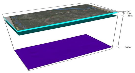 Considering the aquifer thickness of 300 m and aquifer lithology, three-layer model was developed with the bottom of aquifer at 300 m depth. First layer (layer 1) was 7 m thick (from 0–7 m) containing minimum elevation of 135.5 m and maximum elevation of 147.5 m. Second layer (layer 2) was 23 m thick (from 7 to 30 m). Third layer (layer 3) was 270 m thick (from 30 to 300 m) as depicted in Figure 3.