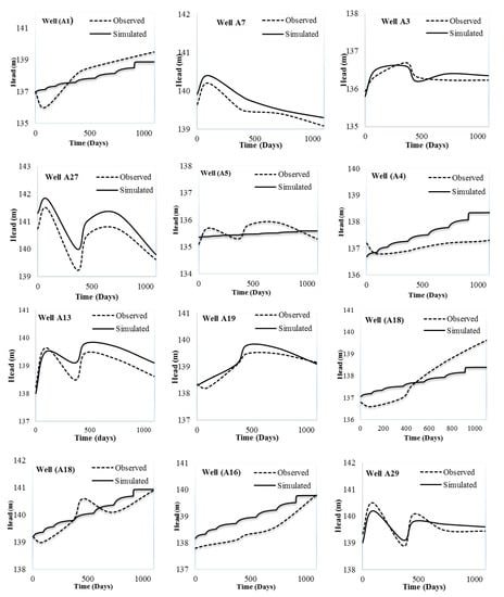 Out of 24 observation wells installed in the study area, data of 6 observations wells were used to calibrate the model for the first six stress periods (April 2011 to March 2014). In the calibration process, simulated groundwater levels (heads) were compared with the observed groundwater levels (heads) by adjusting the hydrogeological parameters (Kh, Kv, Sy and Ss) to the extent at which there was a close agreement between the simulated and observed groundwater levels (heads). Model calibration curves are depicted in Figure 4.
