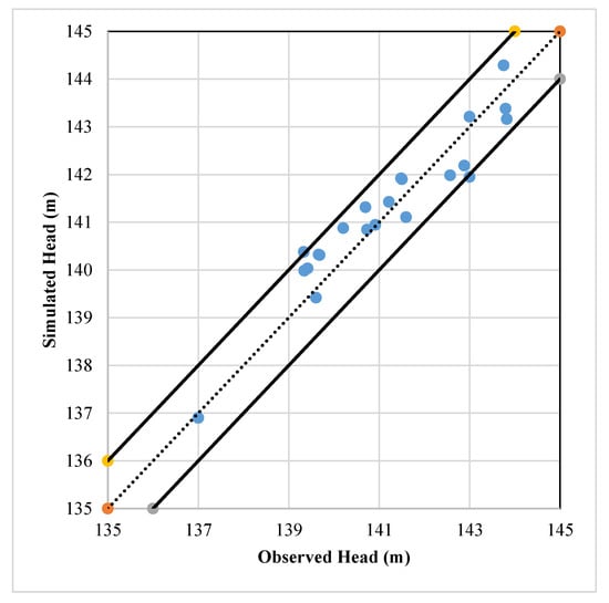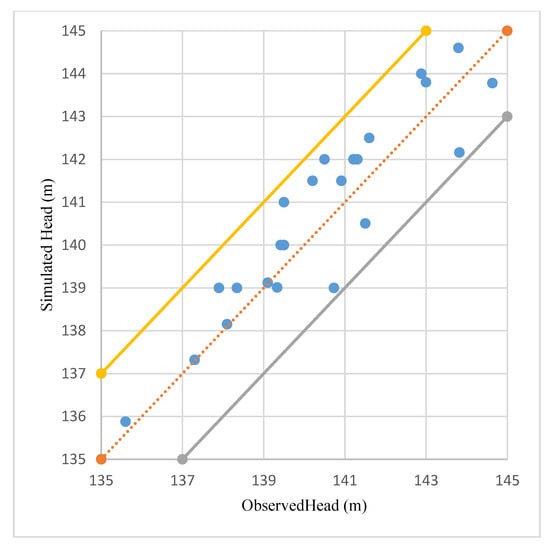 The value of RMSE found after calibration was 0.499 which falls in the RMSE acceptable range of 0–0.7 [12]. Therefore, this value of RMSE showed a close agreement between the simulated and observed groundwater levels. The value of R2 found after calibration was 0.87 which falls in the R2 acceptable range of, 0.7–1 [28] reflecting a good agreement between the simulated and observed groundwater levels. The value of NSE found after calibration was 0.65 which falls in the NSE acceptable range of 0.5–1 [17] reflecting a good agreement between the simulated and observed groundwater levels The values of RMSE, R2 and NSE of 0.499, 0.87 and 0.65, respectively, falling in their acceptable ranges indicated that the model was calibrated reasonably well). Figure 5 shows the graph of simulated and observed groundwater levels at the end of 6th stress period (March 2014). The solid dark lines show the limit of ± 0.5–2 m (Source: Manual of MODFLOW PRO, US Geological Survey (USGS), Denver, CO, USA), dotted line represents the best fit line and points show observed and simulated groundwater levels. Figure 6 reveals that observed and simulated groundwater levels fall within the limit of ±0.5–2 m reflecting that model has been calibrated reasonably well.