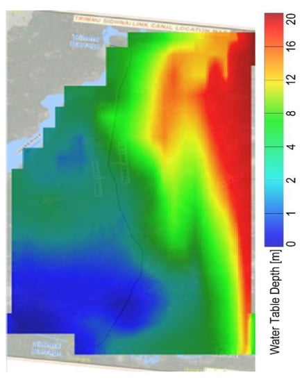 As shown in Figure 7, simulated DTW varied form 0–20 m in the vicinty of the T-S link canal command. On the right side of the T-S link canal, DTW varied from 0 to 4 m. On the left side of the canal DTW varied from 4 to 20 m. Clearly, severely waterlogged area (having DTW in the range of 0–1 m) shown by dark blue color in Figure 7 was found in the right-side command of lower reach of T-S link canal. The simulated DTW values in the range of 4–20 m did not reveal the waterlogged area on the left side of T-S link canal command.