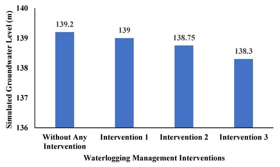The average groundwater level in the study area without any intervention is about 139.2 m which is causing waterlogging problem. Model evaluation revealed water level lowering of 0.20 (from 139.2 to 139 m), 0.45 (from 139.2 to 138.75 m) and 0.90 m (from 139.2 to 138.3 m) under the intervention 1: Rehabilitation of Existing 43 Drainage Tube wells, intervention 2: Rehabilitation of Existing Surface Drainage Network and intervention 3: Combination of Rehabilitation of Existing 43 Drainage Tube wells and Rehabilitation of Existing Surface Drainage Network, respectively (Figure 12). Clearly, intervention 3 (Combination of Rehabilitation of Existing 43 Drainage Tube wells and Rehabilitation of Existing Surface Drainage Network) looks more effective in controlling waterlogging because it could lower groundwater level by 0.90 m which would result in waterlogging reduction in 45% area of severely waterlogged area.