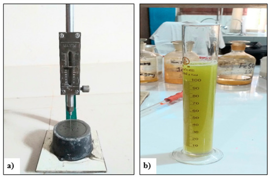 Testing setting times of cement mortar using (a) Vicat’s apparatus and (b) sugarcane juice.
