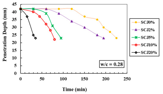 The effect of different percentages of SCJ on the penetration depth of cement paste is shown in Figure 2. In this section, the w/c of 0.28 has been chosen to discuss the effect. As shown in Figure 2, it is obvious that the addition of SCJ can significantly reduce the penetration depth (i.e., setting time) of the cement pastes, and it is more pronounced for the higher percentages of SCJ in the mix. For instance, compared with the control cement paste (0% SCJ), the initial setting time of cement paste is reduced to 33%, 57%, 70%, and 90%, for SCJ content of 2%, 5%, 10%, and 20%, respectively. These outcomes reveal that incorporating SCJ in cement paste works as an accelerator, and this result agrees with the outcome reported in [7]. The authors [7] stated that the setting time of cement pastes increased up to the addition of 0.05% SCJ by weight of cement; after that, a decrease in setting time was observed for the mix containing 0.25% SCJ. It is noteworthy that the present study deals with a higher amount of SCJ than reported in the literature [7,21]. The significant decrease in setting time (i.e., decrease in penetration depths with time) could be due to the acceleration of the hydration process of cement (i.e., it starts losing its plasticity rapidly) and gains adequate strength. Hence, reducing the penetration depth of the Vicat’s apparatus needle in the cement paste compared to the control cement paste.
