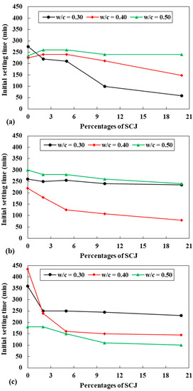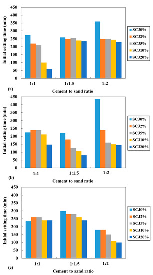 Effect of percentages of SCJ to initial setting time of mortar at c/s ratios of (a) 1:1, (b) 1:1.5, and (c) 1:2.